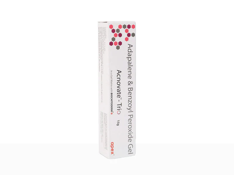 Acnovate-Trio Gel is a prescription medication that contains a combination of medicines that are used to treat acne, which are Adapalene and Benzoyl Peroxide. The gel removes the dead layer of skin on the surface of the skin and prevents the growth of bacteria. This helps to improve the appearance of acne and prevent new breakouts from forming.