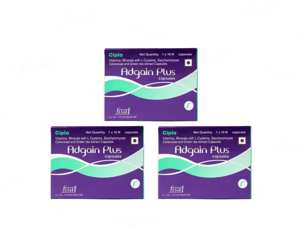 Adgain Plus Capsules are a dietary supplement designed to treat hair loss and improve hair health caused by stress and structural changes. Enriched with L-Cysteine, Brewer's Yeast, and Biotin, they protect against sun damage, reduce greying, and strengthen hair. Suitable for addressing hair fall, retarded growth, and damaged hair, Adgain Plus Capsules promote resilient, healthy, and vibrant hair.
