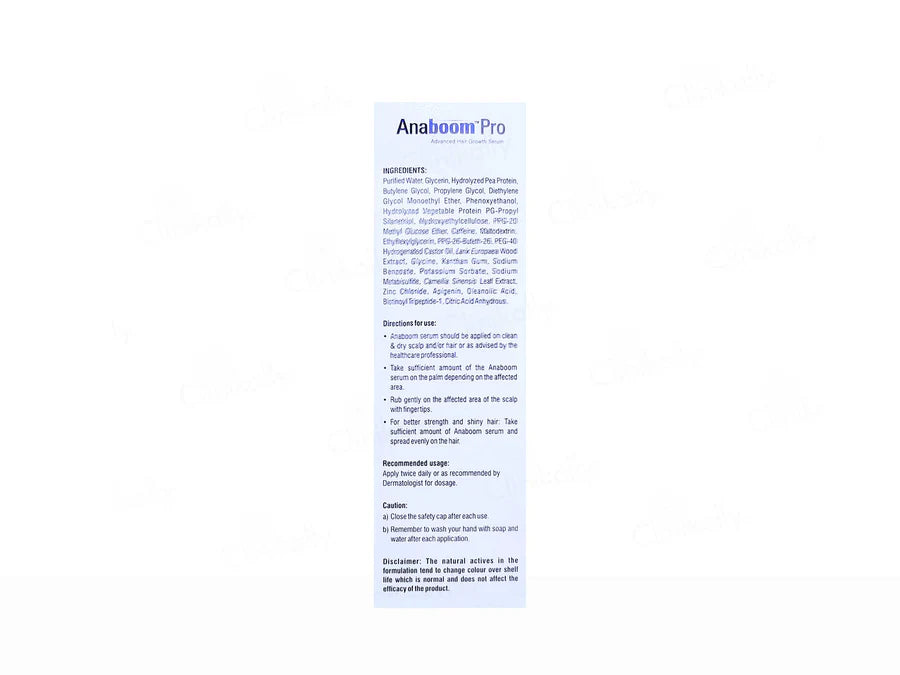 Anaboom Pro Advanced Hair Growth Serum is an innovative formula designed to promote hair growth and reduce hair fall. Enriched with potent ingredients like Procapil, Redensyl, Caffeine, Keravis, Promois, and Hydrolyzed Pea Protein, this serum targets the hair follicles to strengthen and nourish them from the roots. It improves scalp health, enhances hair density, and adds volume and shine. Suitable for all hair types, regular use of this serum can lead to visibly thicker and healthier hair.