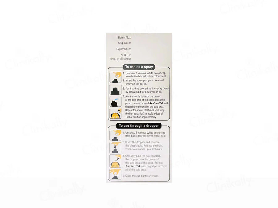 Anasure-F 5% Topical Solution is a trusted remedy for hair loss and baldness. Featuring Minoxidil and Finasteride, it effectively promotes hair regrowth, especially in men suffering from male pattern baldness. This easy-to-apply solution revitalizes hair follicles, increasing hair density and thickness. Anasure-F 5% Topical Solution is a reliable choice for regaining a fuller, more youthful head of hair and boosting self-confidence.