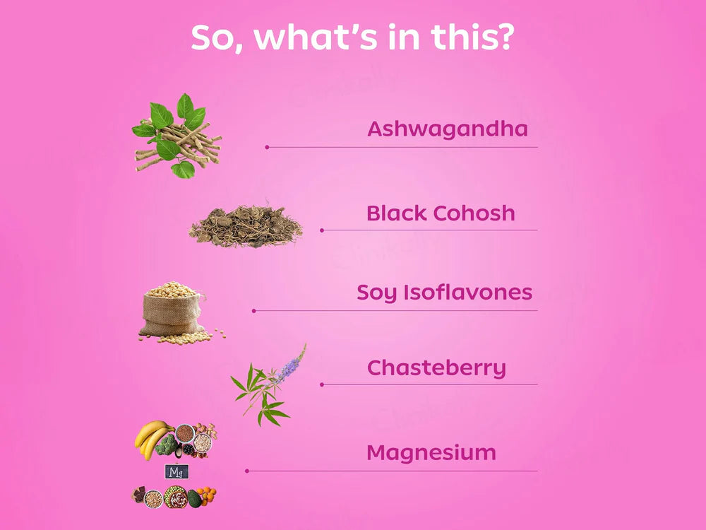 Reduces stress and hot flashes with Ashwagandha and Black Cohosh.