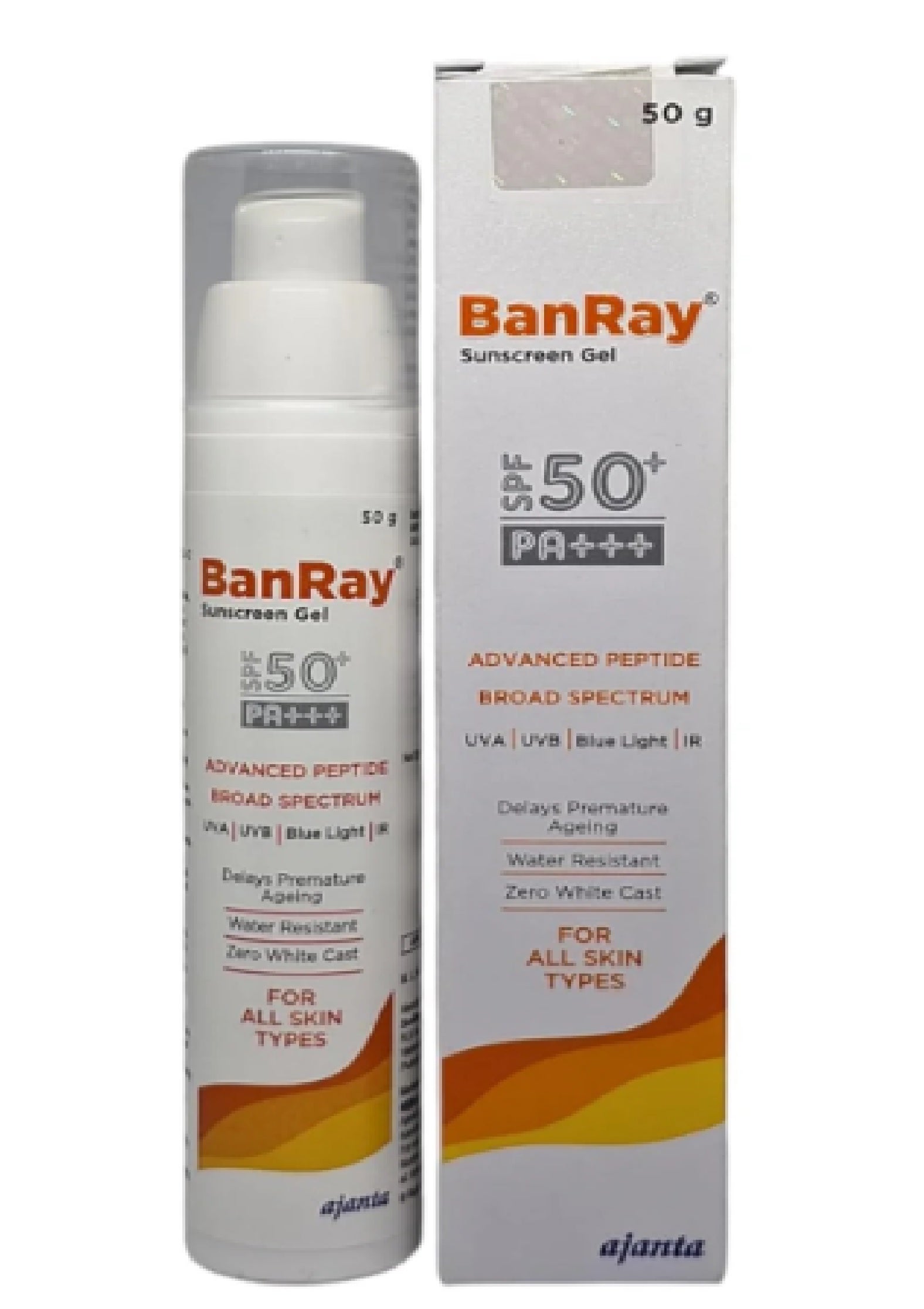 Banray Advanced Peptide Sunscreen Gel SPF 50+ PA+++ provides high-level sun protection while nourishing the skin with peptides and antioxidants. This lightweight, non-greasy formula offers broad-spectrum defense against UVA, UVB, IR and Blue Light rays, helping to prevent premature aging and sunburn. Its unique blend of ingredients promotes collagen production, delays premature ageing, hydrates the skin, and enhances elasticity, leaving the skin smooth and radiant. Ideal for daily use, this sunscreen is suitable for all skin types and leaves no white cast.
