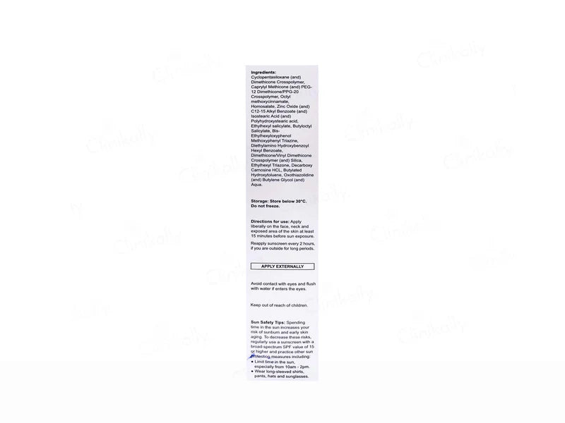 Apply generously to the face and neck 15 minutes before sun exposure.