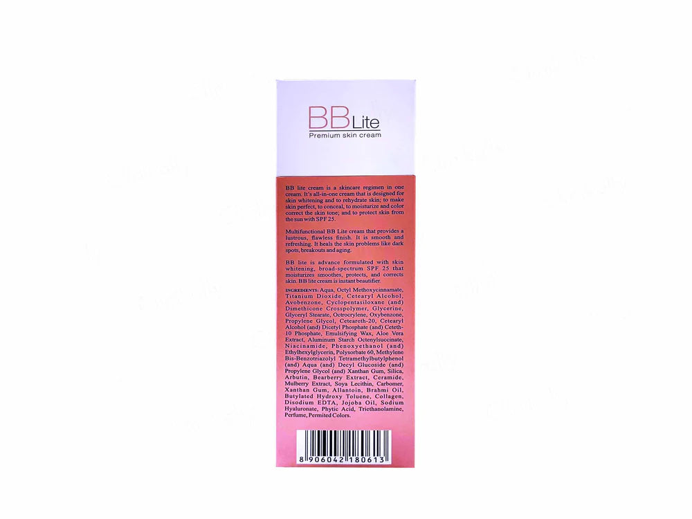 BB Lite Premium All in One Skin Whitening Cream SPF 25 PA++ is a multi-action skincare solution designed to brighten, conceal, moisturize, and protect your skin in one step. This advanced formula is enriched with niacinamide, arbutin, aloe vera, collagen, and bearberry extract to even out skin tone, reduce dark spots, and hydrate deeply. With SPF 25 PA++ broad-spectrum sun protection, it shields the skin from UVA and UVB damage. Ideal for daily use, this lightweight BB cream delivers a smooth, luminous finish while correcting imperfections and preventing signs of aging. Suitable for all skin types.