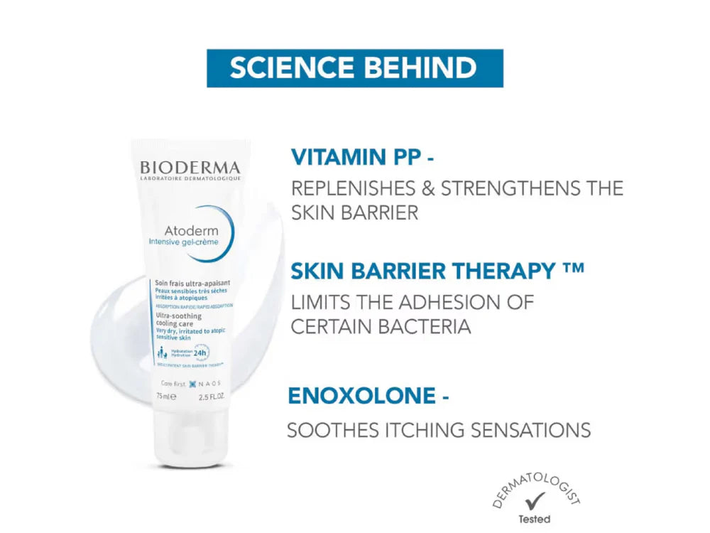 Bioderma Atoderm Intensive Gel-Crème is a fast-absorbing, ultra-soothing moisturizer designed for very dry, irritated, and atopic sensitive skin. This anti-itching, lipid-replenishing gel-cream hydrates deeply for 24 hours while instantly calming discomfort. Its light, non-sticky texture penetrates quickly, making it perfect for daily use by the entire family (except premature infants). Enriched with skin-strengthening actives, it restores skin barrier function, reduces redness, and boosts long-lasting comfort. Fragrance-free and highly tolerable, Atoderm Intensive Gel-Crème provides immediate relief and protection for hypersensitive, eczema-prone skin.