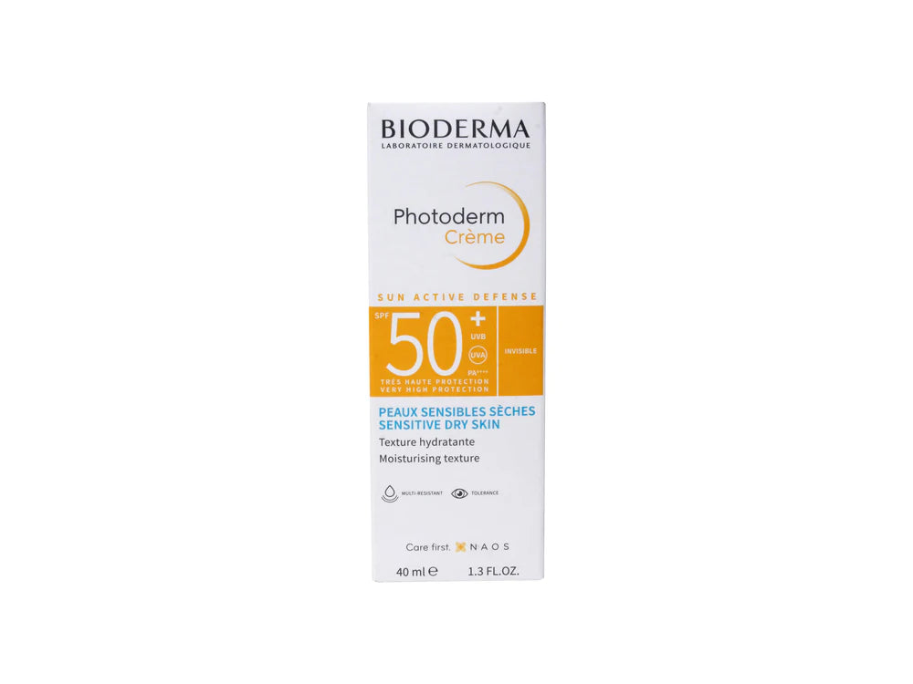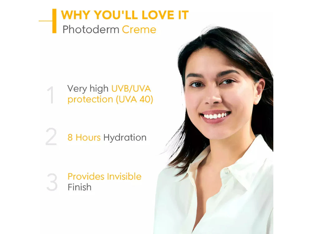 Bioderma Photoderm Creme SPF 50+ PA++++ offers advanced sun protection, especially reinforced against UVA rays. Combining UV filters with patented biological protection, it enhances the skin's defense mechanisms, preventing tanning and sun spots. This non-greasy sunscreen is ideal for long sun exposure, maintaining skin health over time. Being moisturising, Bioderma Photoderm Creme is ideal for sensitive, dry skin.