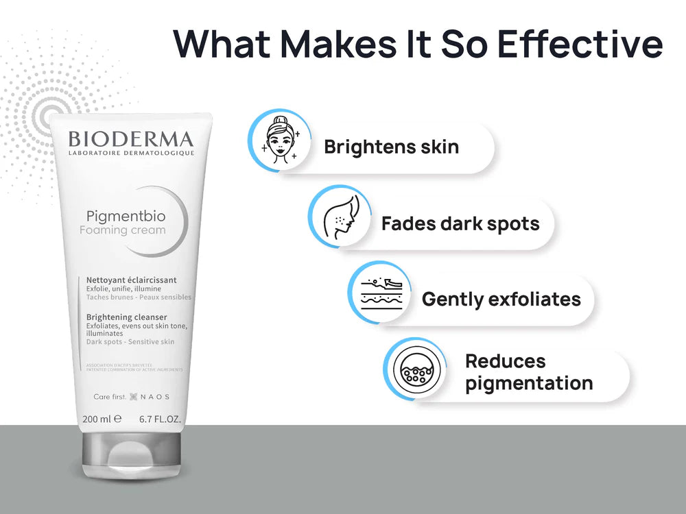 Bioderma Pigmentbio Foaming Cream is a brightening cleanser that gently exfoliates to remove dark spots and even out skin tone. Enriched with AHAs and microbeads, it promotes cell renewal, leaving the skin smooth and radiant. Its creamy foam texture ensures a refreshing cleanse while LumiReveal™ Technology boosts skin brightness. Suitable for all skin types, it reveals a luminous complexion.