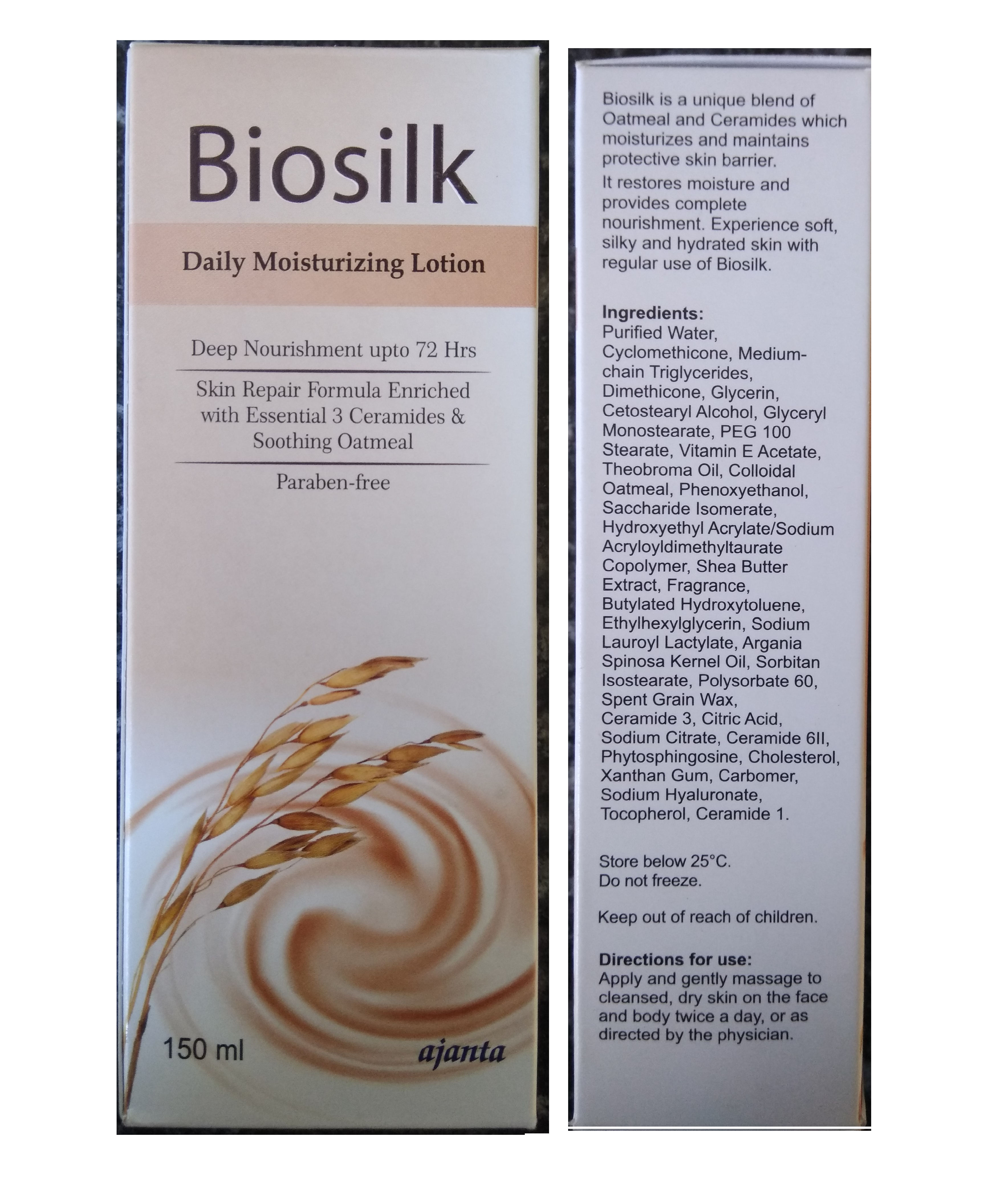 Biosilk Daily Moisturizing Lotion contains a blend of oatmeal and ceramides, which can help moisturise and maintain the skin barrier. It can make the skin soft, silky, and hydrated. It may restore moisture and provide nourishment.