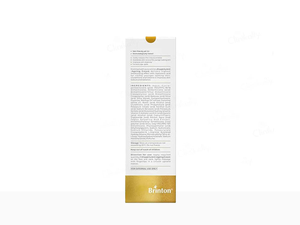Brinton D’experts Anti-Ageing Cream is a dermatologist-tested, skin-friendly formula enriched with pure retinol, hyaluronic acid, glutathione, moringa, camelina oil, and Gatuline® RC Bio to visibly reduce fine lines, wrinkles, and age spots. Its advanced anti-aging actives work synergistically to boost collagen production, improve skin elasticity, and deliver deep hydration for firmer, younger-looking skin. With a pH-balanced base, this cream is gentle on all skin types and ideal for daily use. Brinton D’experts Cream restores skin radiance, corrects uneven tone, and enhances skin texture—making it a complete solution for mature and tired skin.