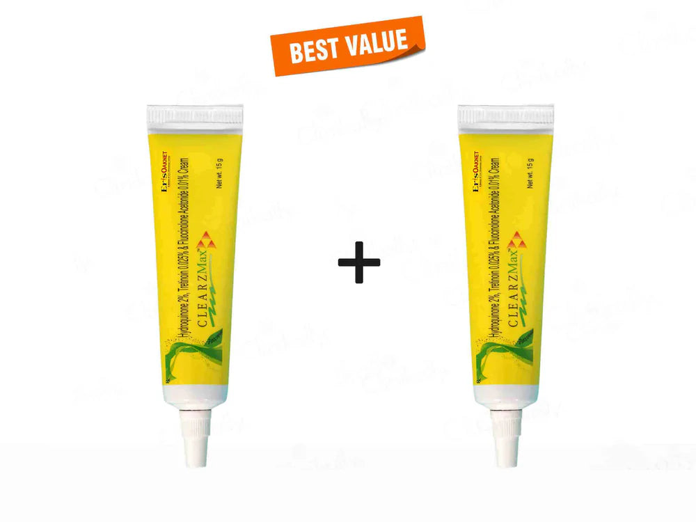 Clearz Max Cream is a dermatologist-prescribed triple-action depigmenting formula designed to effectively lighten hyperpigmented skin and reduce dark spots, melasma, and discoloration. It contains Hydroquinone 2%, Tretinoin 0.025%, and Fluocinolone Acetonide 0.01%, which work together to inhibit melanin production, promote skin cell turnover, and reduce inflammation. Ideal for short-term use under medical supervision, Clearz Max Cream visibly improves skin tone and texture while addressing stubborn pigmentation. Recommended for nighttime application, this cream delivers targeted results for visibly clearer and brighter skin. Not suitable for long-term or unsupervised use.