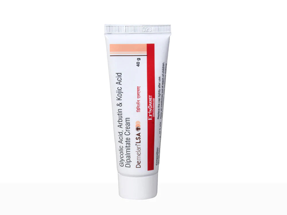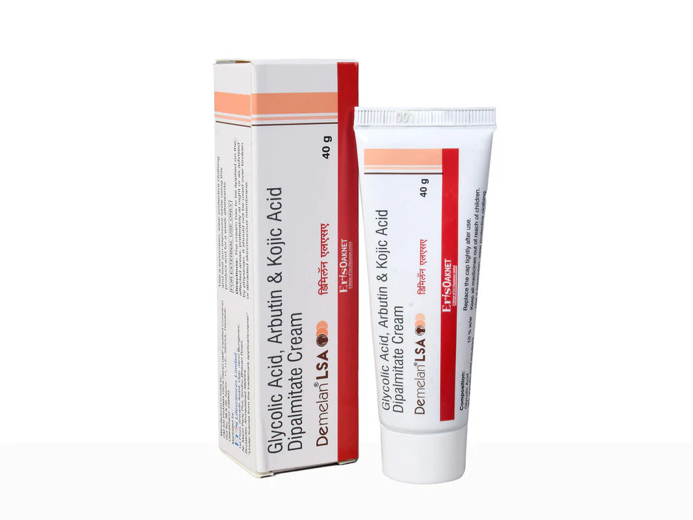 Demelan LSA Cream is a dermatologist-formulated pigmentation treatment enriched with 10% Glycolic Acid, 5% Arbutin, and 2% Kojic Acid Dipalmitate. This powerful trio targets dark spots, melasma, acne marks, and uneven skin tone by exfoliating dead skin cells, brightening the complexion, and reducing melanin production. Ideal for dull and pigmented skin, Demelan LSA Cream promotes a smoother, clearer, and radiant appearance. With consistent use, it visibly improves skin texture and tone. Suitable for nighttime use under professional guidance for optimal results.