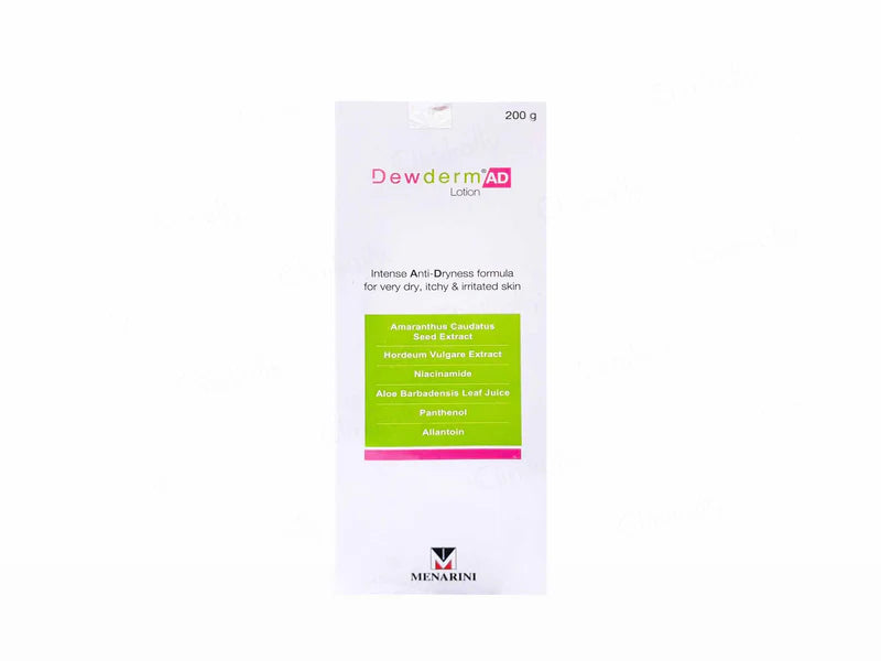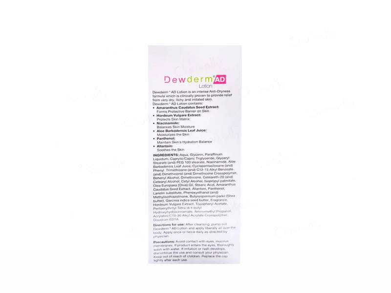 Dewderm AD Anti-Dryness Lotion is a dermatologist-formulated, daily-use body lotion designed to relieve dry, irritated, and sensitive skin. Enriched with emollients, moisturizers, and skin-repairing agents, it helps restore the skin's natural moisture barrier and provides long-lasting hydration. Its non-greasy, fast-absorbing texture makes it ideal for regular use on all skin types, including eczema-prone and atopic skin. Dewderm AD soothes itching, flaking, and discomfort, promoting soft, healthy, and comfortable skin.