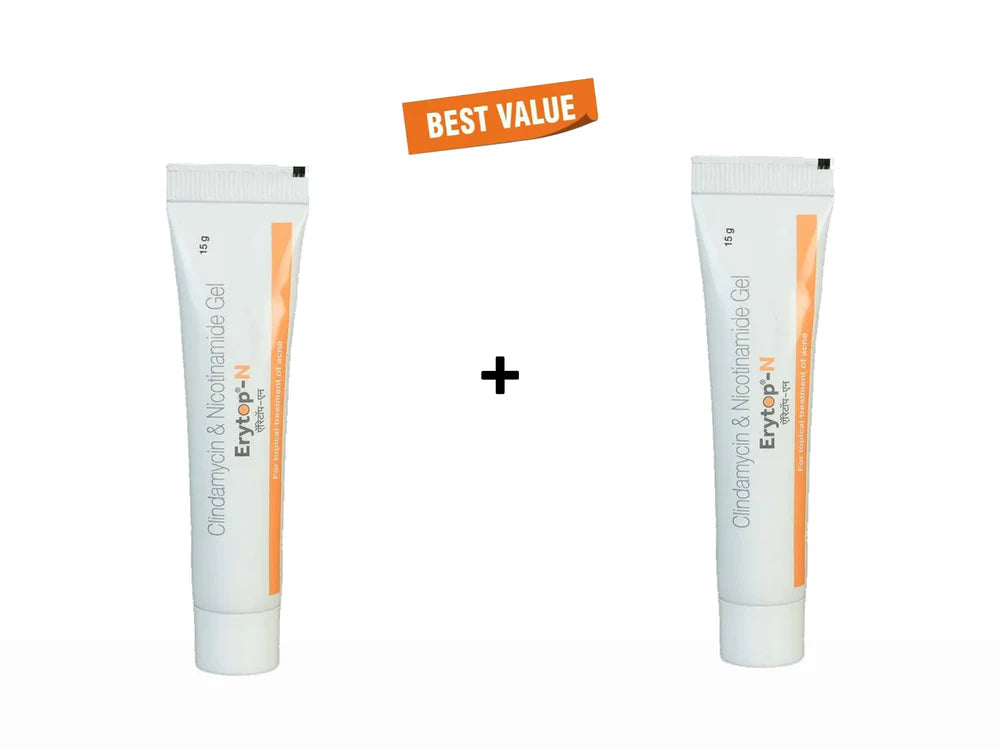 Erytop-N Gel is a topical anti-acne formulation that combines Clindamycin Phosphate (1%) and Nicotinamide (4%), offering a dual-action solution for treating mild to moderate acne. While Clindamycin acts as a topical antibiotic to eliminate acne-causing bacteria, Nicotinamide (Vitamin B3) works as an anti-inflammatory to reduce redness, swelling, and post-acne marks. This lightweight, non-greasy gel is suitable for oily and acne-prone skin, helping to clear existing breakouts and prevent new ones with regular use.