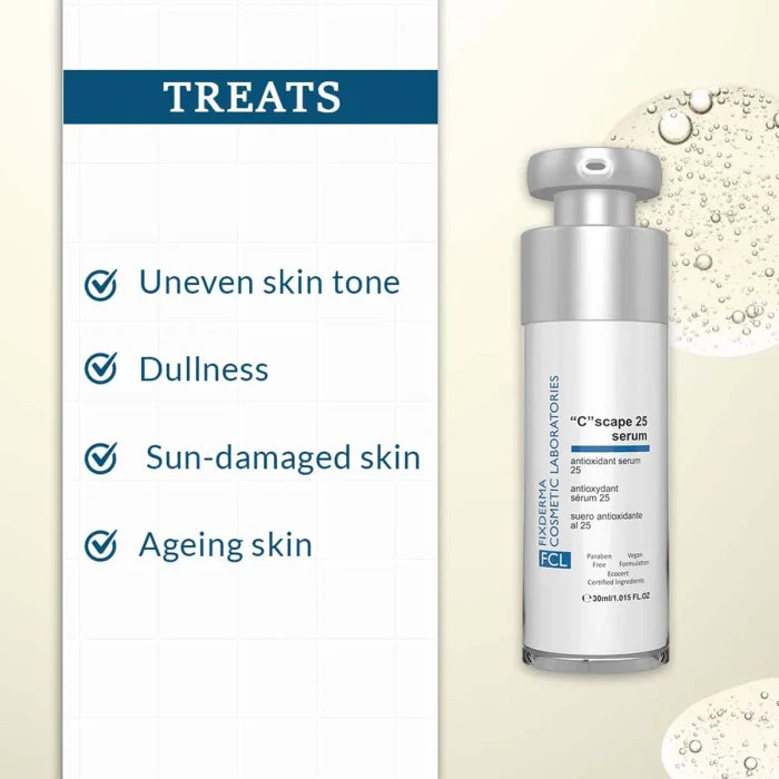 FCL C Scape 25 Serum is a high-potency skincare serum formulated with 25% pure Vitamin C to help brighten the skin and reduce the appearance of dark spots and uneven tone. Known for its antioxidant properties, Vitamin C supports skin protection against environmental stressors while promoting a smoother, more radiant complexion. The lightweight, fast-absorbing formula is suitable for all skin types, including sensitive skin. With regular use, the serum helps improve skin texture, firmness, and clarity. It is ideal for daily use as part of your morning skincare routine. FCL C Scape 25 Serum is dermatologically tested and free from parabens. This product is cosmetic in nature and not intended to treat or prevent any disease. For best results, use as directed by a dermatologist or skincare professional. Individual results may vary.