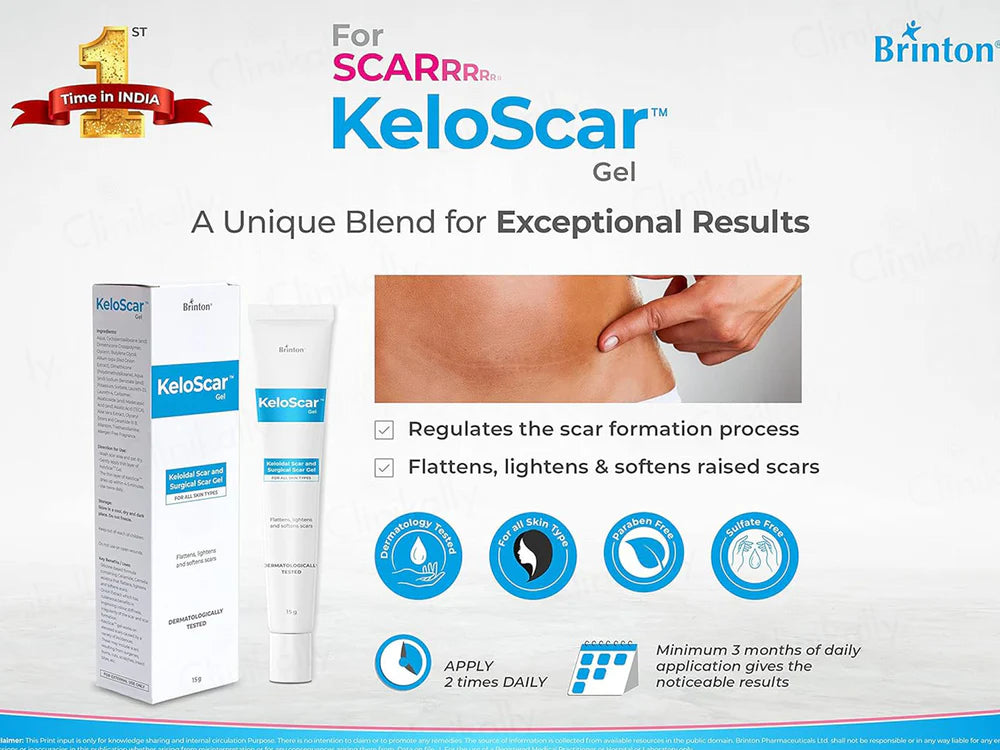 KeloScar Gel is a specialized topical treatment designed to improve the appearance of scars and reduce their size and thickness. Formulated with advanced silicone technology, it helps flatten, soften, and smooth raised scars caused by surgery, injuries, burns, or acne. The gel forms a protective layer over the scar, preventing further damage while promoting faster healing. KeloScar Gel is lightweight, non-greasy, and quickly absorbed, making it ideal for daily use. It works on both old and new scars, reducing redness, discoloration, and overall visibility over time.