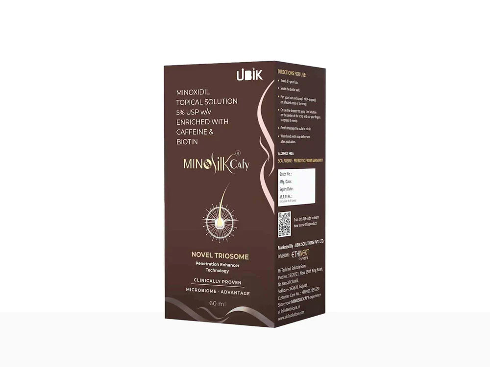 Minosilk Cafy Topical Solution is a medication containing the active ingredient Minoxidil. It is commonly used to treat hair loss, particularly in cases of male pattern baldness and female pattern hair loss. Applied directly to the scalp, it promotes hair growth by stimulating hair follicles and improving blood flow. It is available as an over-the-counter treatment for hair regrowth.