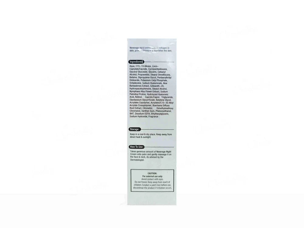 Neverage Night Anti-Ageing Cream is a nourishing night cream designed to support skin renewal and reduce visible signs of ageing. Formulated with peptides, antioxidants, and hydrating agents, it works overnight to help improve skin elasticity, firmness, and smoothness. The cream helps minimize the appearance of fine lines and wrinkles while promoting a more youthful, radiant complexion. Its rich, non-greasy texture is suitable for all skin types and is ideal for daily nighttime use. With continued use, the skin may appear plumper, more even-toned, and refreshed. Dermatologically tested and free from parabens and harsh chemicals. This is a cosmetic product, not intended to diagnose, treat, cure, or prevent any disease. For best results, use as directed and incorporate into a consistent skincare routine. Results may vary by individual.