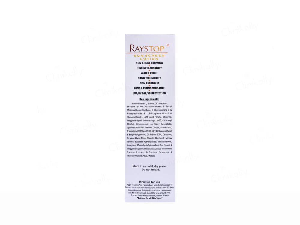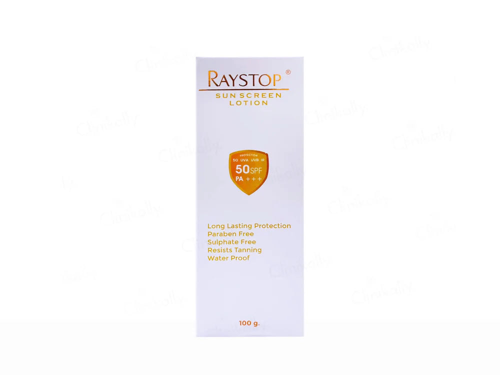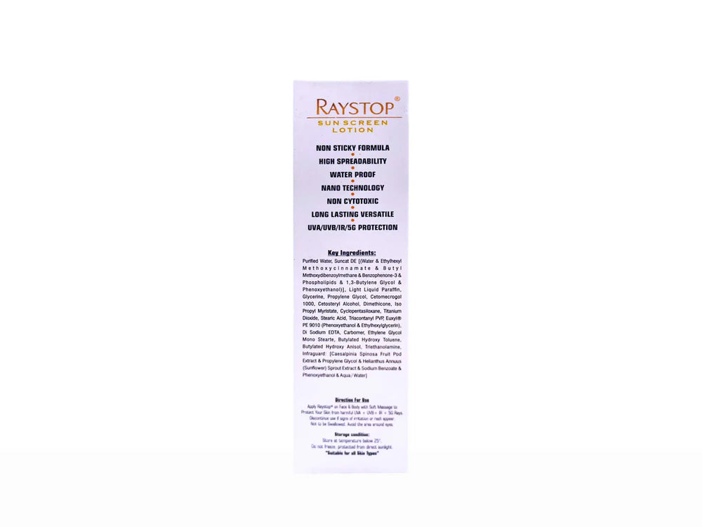 Raystop Sunscreen Lotion SPF 50 PA+++ provides broad-spectrum protection against harmful UVA, UVB and Infra Red rays, helping to prevent sunburn, premature aging, and pigmentation. This lightweight, non-greasy, paraben and sulphate free sunscreen lotion is quickly absorbed by the skin, leaving it feeling soft and hydrated without any white cast. Formulated with skin-soothing and hydrating ingredients, it not only protects but also nourishes the skin, making it ideal for daily use. Suitable for all skin types, Raystop Sunscreen Lotion ensures comprehensive sun protection and resists tanning while maintaining the skin's natural moisture balance.