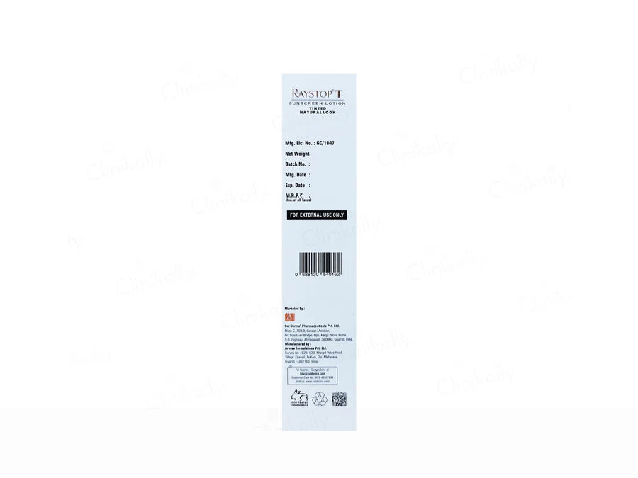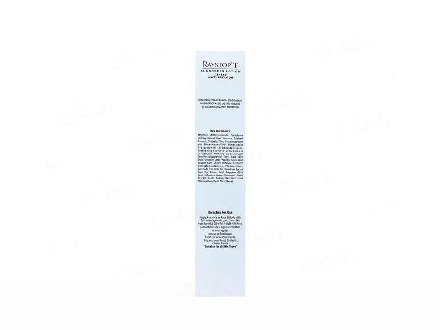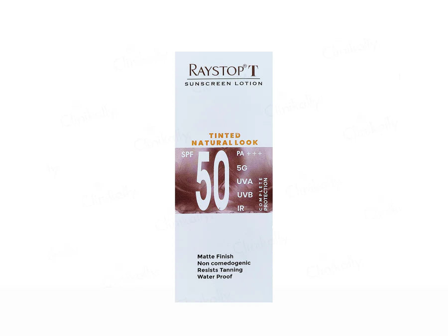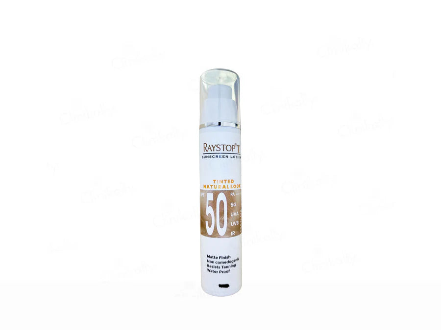 Raystop T Sunscreen Lotion SPF 50 PA+++ offers powerful broad-spectrum protection against UVA, UVB, IR, and 5G radiation. Its tinted, matte finish blends seamlessly into the skin for a natural look without clogging pores. Designed with a non-sticky formula, this waterproof sunscreen lotion ensures high spreadability and long-lasting wear. Ideal for daily use, Raystop T shields skin from tanning, melasma, pigmentation, sunburn, and premature aging while maintaining comfort and coverage throughout the day.
