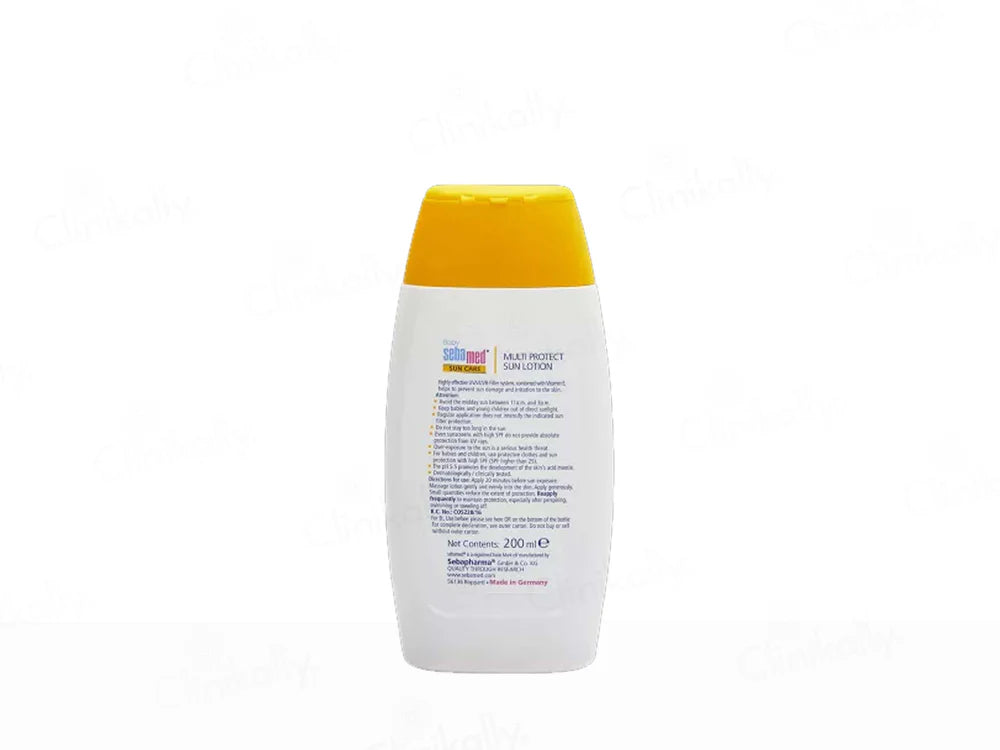 Sebamed Baby Multi Protect Sunscreen Lotion SPF 50+ is a dermatologically and clinically tested sun protection formula specially designed for baby’s delicate and sensitive skin. Offering broad-spectrum protection against UVA and UVB rays, it features micronized Titanium Dioxide and a multi-filter system that provides high-level sun defense without penetrating the skin. With a pH value of 5.5, it supports the skin’s natural barrier while Vitamin E and Provitamin B5 help to hydrate and soothe the skin. The formula is water-resistant, free from parabens, alcohol, and colorants, making it ideal for infants and toddlers.