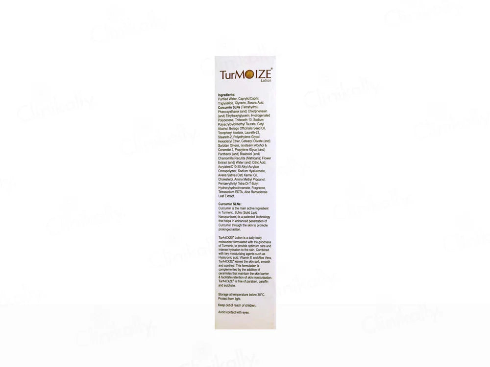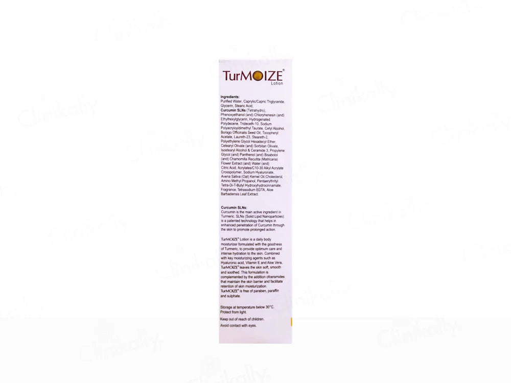 Turmoize Lotion is a daily body moisturizer formulated with turmeric to provide optimal care and intense hydration to the skin. Combined with key moisturizing agents such as hyaluronic acid, vitamin E, and aloe vera, Turmoize leaves the skin soft, smooth, and soothed. This formulation is complemented by the addition of ceramides that maintain the skin barrier and facilitate the retention of skin moisturization. Turmoize is free of parabens, paraffin, and sulfates.
