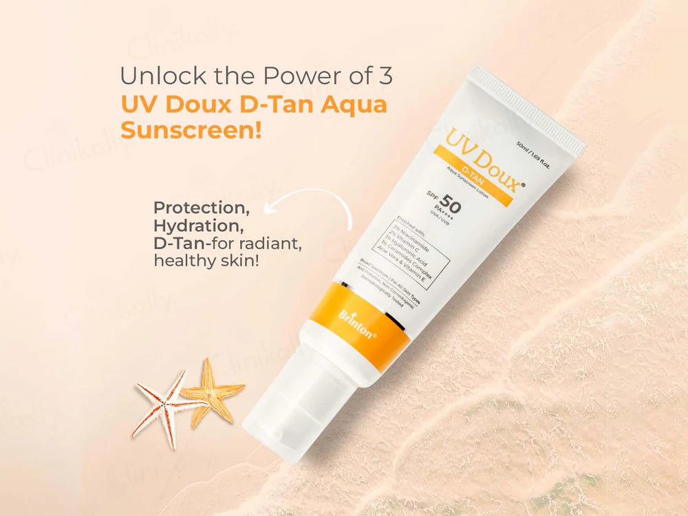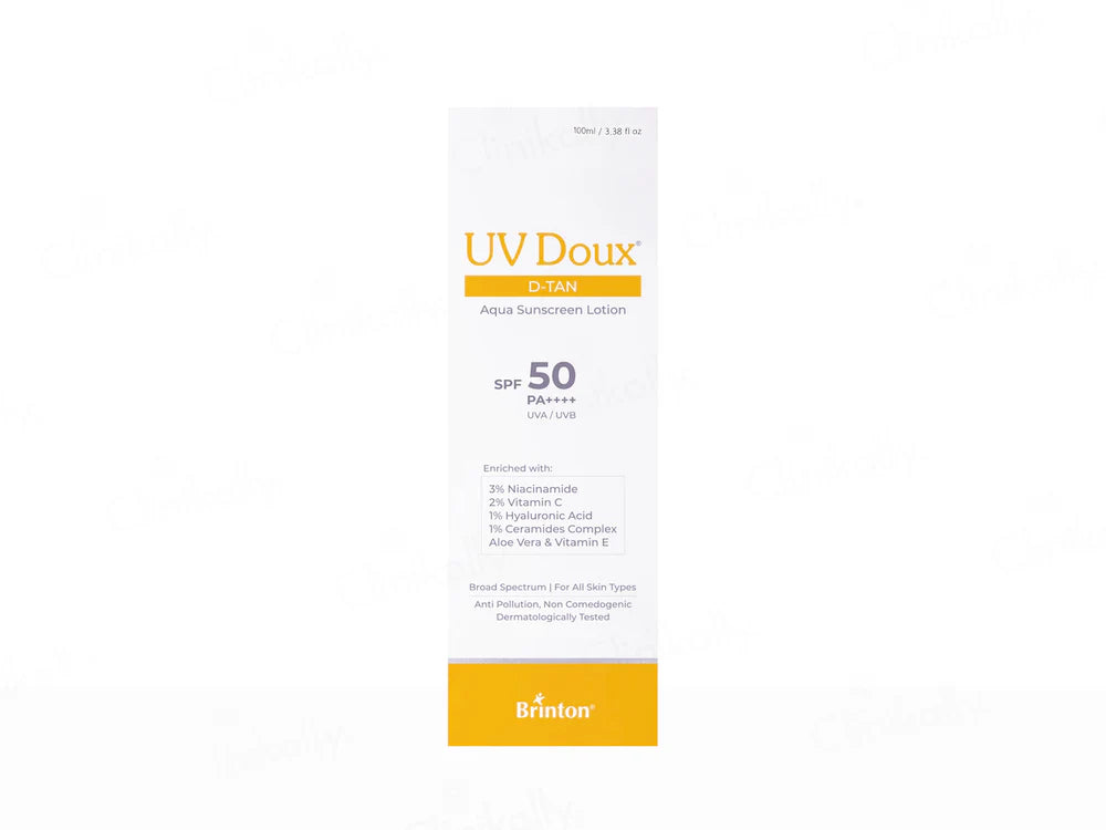 UV Doux D-Tan Aqua Sunscreen Lotion SPF 50 PA++++ is a hydrating sunscreen that provides superior broad-spectrum protection against UVA and UVB rays while reducing tan and preventing sun damage. Its lightweight, water-based formula absorbs quickly, leaving no greasy residue or white cast. Enriched with skin-soothing and nourishing ingredients like Niacinamide, Vitamin C, Hyaluronic Acid and Ceramides, it maintains hydration and promotes an even skin tone. Ideal for daily use, with the goodness of Vitamin E and Aloe Vera, UV Doux D-Tan Aqua Sunscreen Lotion is suitable for all skin types.