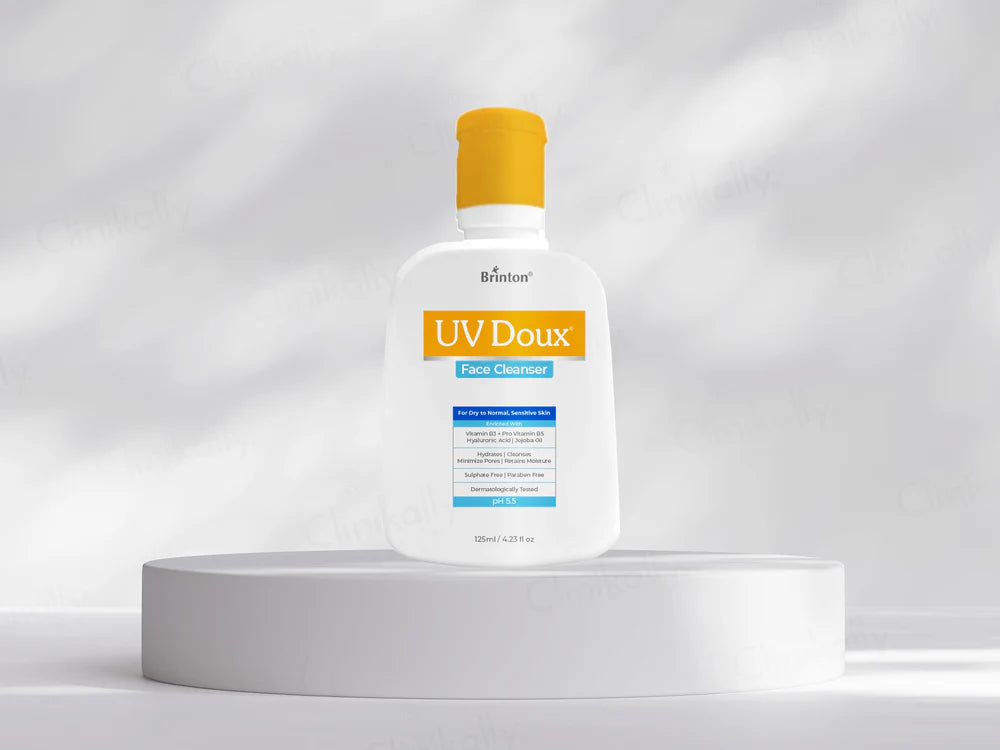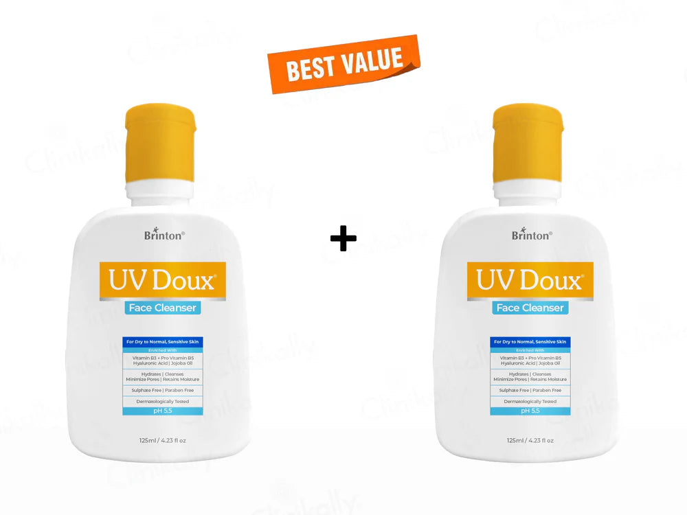 UV Doux Face Cleanser for Dry to Normal, Sensitive Skin is a gentle yet powerful formula enriched with Niacinamide, Panthenol, and Jojoba Oil to hydrate, soothe irritation, and improve skin texture. Infused with Hyaluronic Acid, it locks in moisture, leaving skin plump and refreshed. This mild cleanser removes impurities while preventing breakouts, ensuring balanced, healthy skin all day. Experience deep cleansing with long-lasting hydration for a smooth, revitalized complexion.