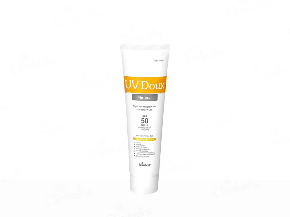 UV Doux Mineral Sunscreen Gel SPF 50 PA+++ is a broad-spectrum, 100% physical sunscreen formulated with Zinc Oxide and Iron Oxide to protect against UVA and UVB rays. With a matte finish and tinted, non-comedogenic texture, it suits all skin types—including sensitive and acne-prone skin. This oil-free, water-resistant sunscreen offers high protection without white cast, making it ideal for daily use and kid-safe sun defense.