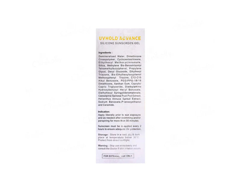 UVHold Advance Silicone Sunscreen Gel SPF 50 PA++++ offers broad-spectrum protection against harmful Blue Light, Infra Red, 5G, UVA and UVB rays. Its advanced silicone-based gel formula provides a non-greasy, lightweight, and water-resistant shield that protects the skin from sun damage and prevents tanning, sunburn, and premature aging. This sunscreen gel is ideal for all skin types, especially oily and acne-prone skin, as it absorbs quickly without leaving a white cast or greasy residue. UVHold Advance is designed for daily use to keep the skin safe from sun exposure while ensuring a matte finish.