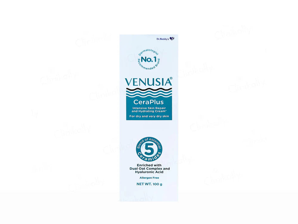 Venusia CeraPlus Intensive Skin Repair and Hydrating Cream is a dermatologist-recommended moisturizer specifically formulated for dry and very dry skin. Powered by a unique blend of 5 essential ceramides, Dual Oat Complex (oat kernel oil and oat bran extract), and hyaluronic acid, it deeply hydrates, repairs the skin barrier, and soothes irritation. The rich, non-greasy formula is free from parabens, alcohol, animal oil, and allergens, making it suitable for all skin types—including sensitive skin. Regular use restores softness, reduces water loss, and protects against further damage, leaving skin healthy, supple, and resilient.